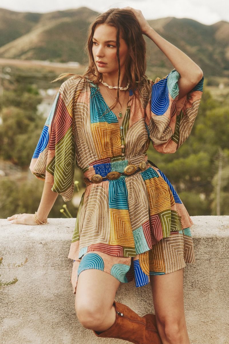 Printed v-neck bubble sleeve romper featuring smocking at waist. Button closure at bust. Lined. Woven. Non-sheer. Lightweight.